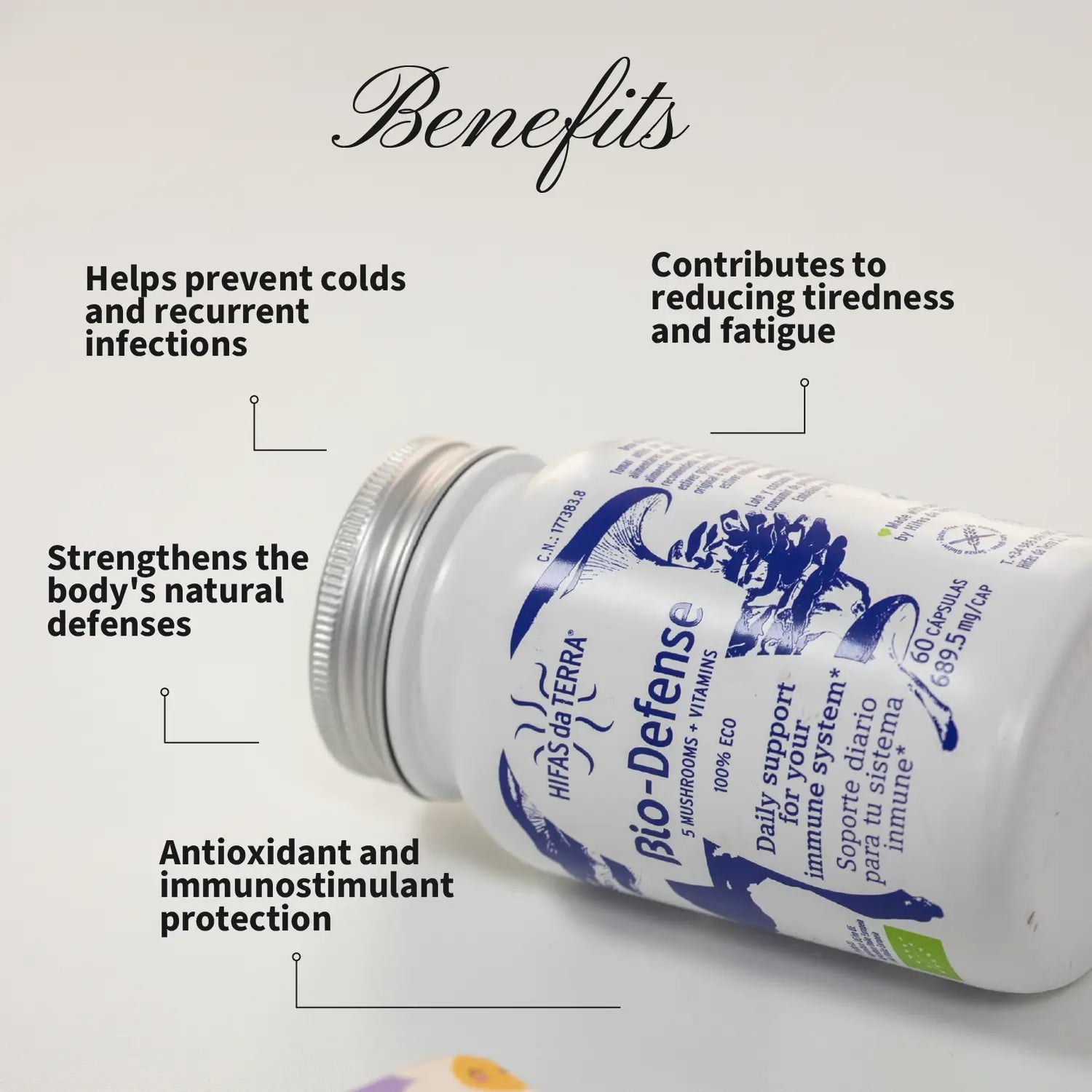 La sua formula combina Reishi (Ganoderma lucidum), Shiitake (Lentinula edodes), Maitake (Grifola frondosa), Pleurotus ostreatus e Pleurotus eryngii, funghi noti per il loro contributo alle difese naturali. Contiene inoltre beta-glucani e polisaccaridi attivi che favoriscono il corretto funzionamento del sistema immunitario.