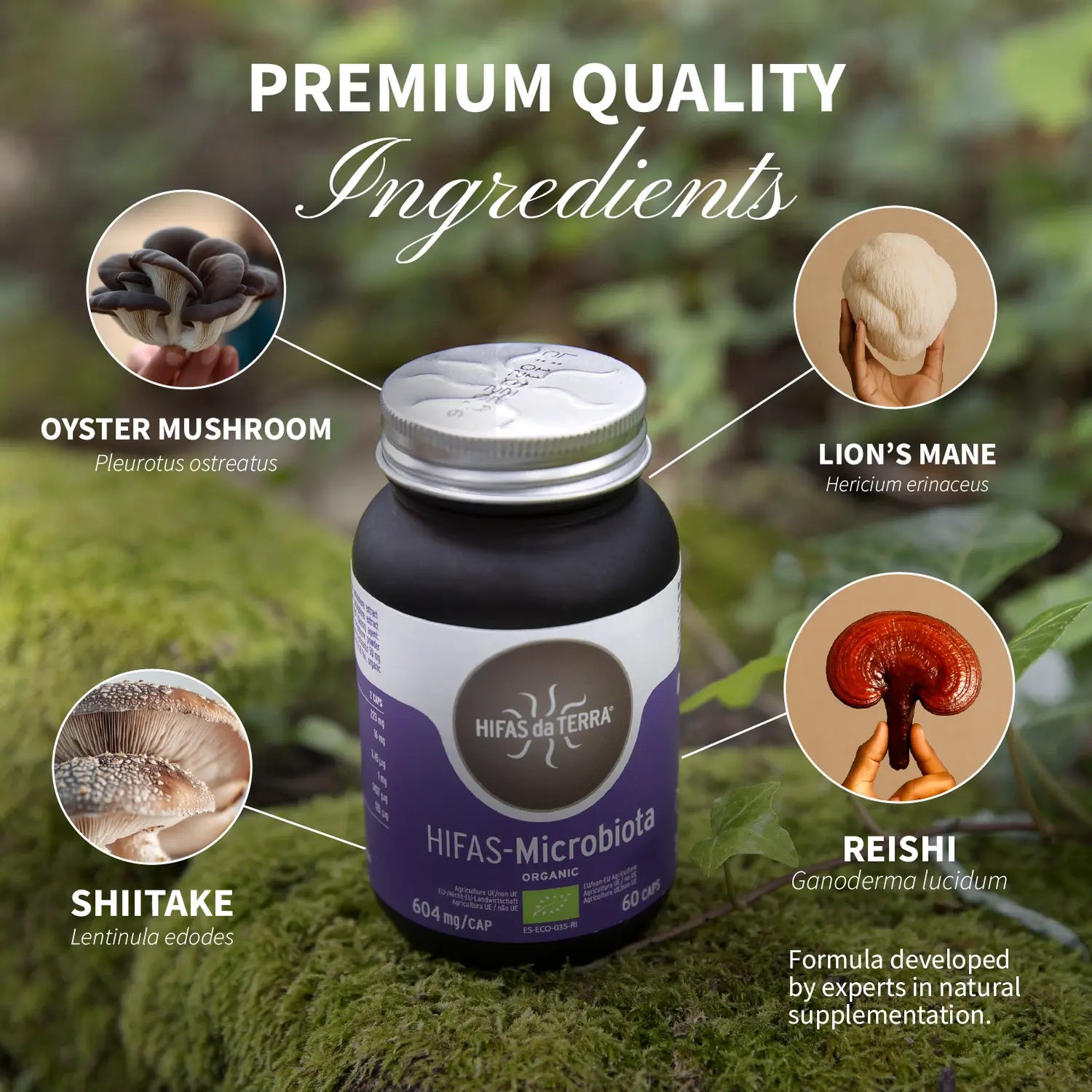 Food supplement. Formats: glass and refill. 60 capsules (604 mg) of pure standardised extracts of Hifas da Terra selected from unique strains with the best analytical results. Each capsule contains 150 mg of organic extract of Hericium erinaceus (Herizumib®), 150 mg of organic extract of Ganoderma lucidum (Ganozumib®), 50 mg of organic powder from Hericium erinaceus (Herimax®), 50 mg of organic powder from Pleurotus ostreatus and 50 mg of organic powder from Lentinula edodes.