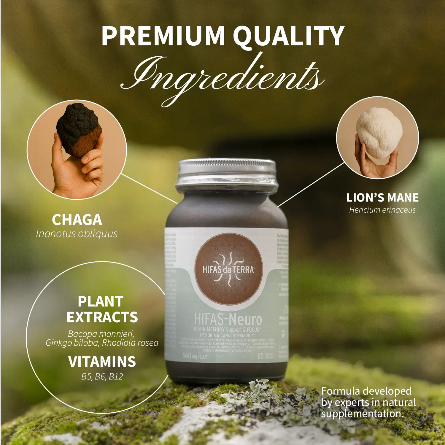 Hifas-Neuro is a food supplement formulated with pure mushrooms Hericium erinaceus (Lion's Mane), Inonotus obliquus (Chaga) and natural extracts such as Bacopa monnieri, Ginkgo biloba, phosphatidylserine and the adaptogen Rhodiola rosea. All these ingredients have been carefully selected for their benefits for cognitive function.