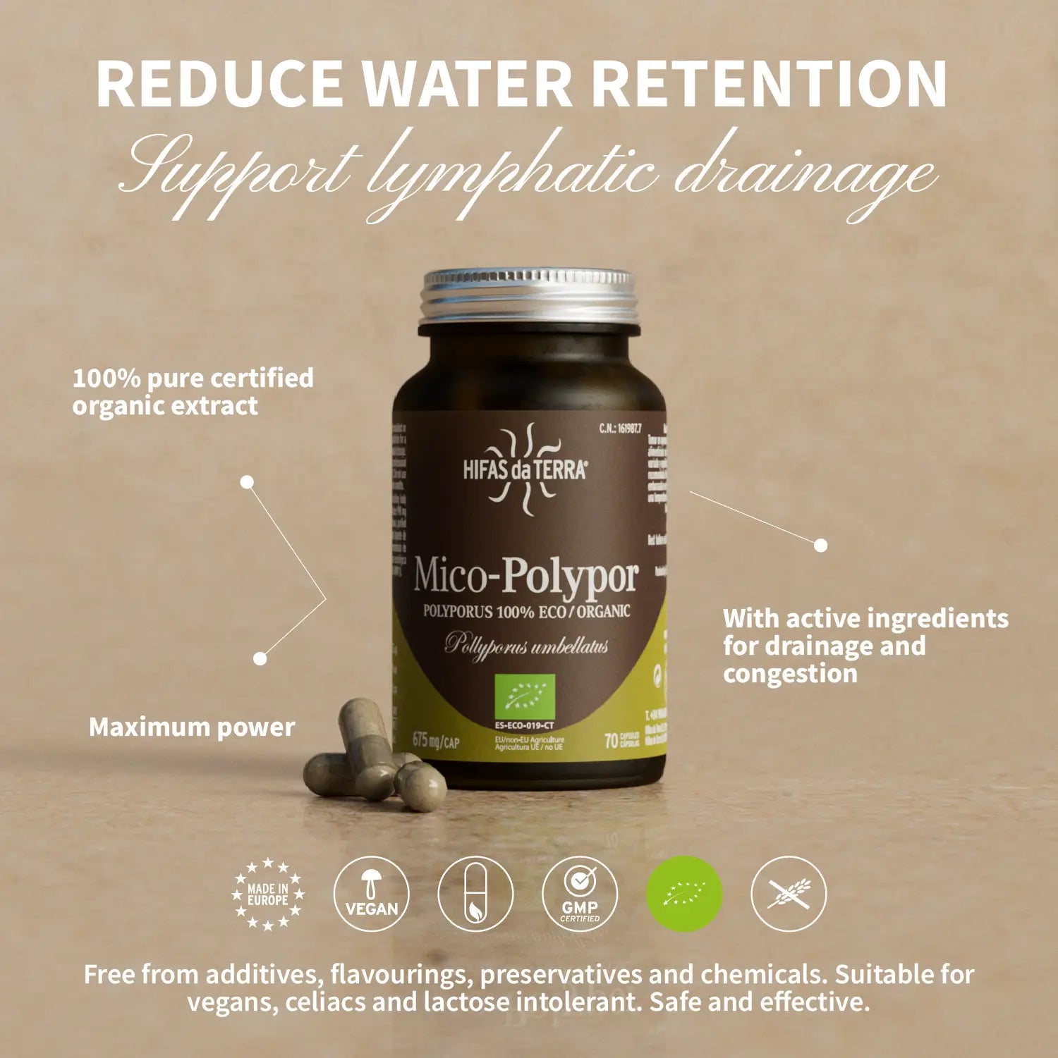 Mico-Polypor It contains an ecological extract of the fungus that helps to feel better and lighter: the Polyporus umbellatus. This fungus has been used by MTC for retention in the body, hence its effects are now investigated at the scientific level. This is the more concentrated formula that you will find in the market made with Polyporus since it only contains Pure fruitful extract of the ecological fungus. We do not use substrates or micelios in this formula, which makes it more pure and effective.
